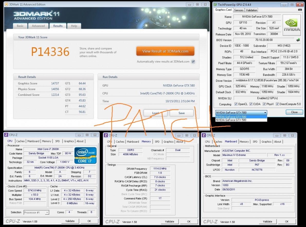 3d06 has real potential with Sandy Bridge SLI, but would take a lot of time. Have to re-run a billion times to get all good subtests. I kept getting phenomenal proxy scores with crap gt3 scores, or crap proxy scores with awesome gt3's, great GT1/2/3 with crap deep freeze, etc..