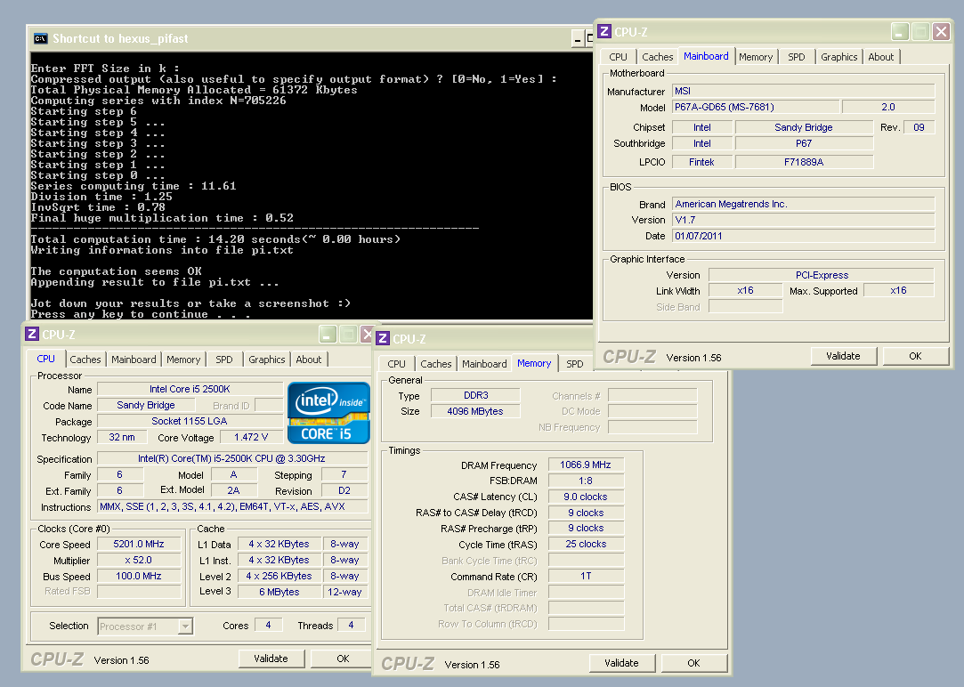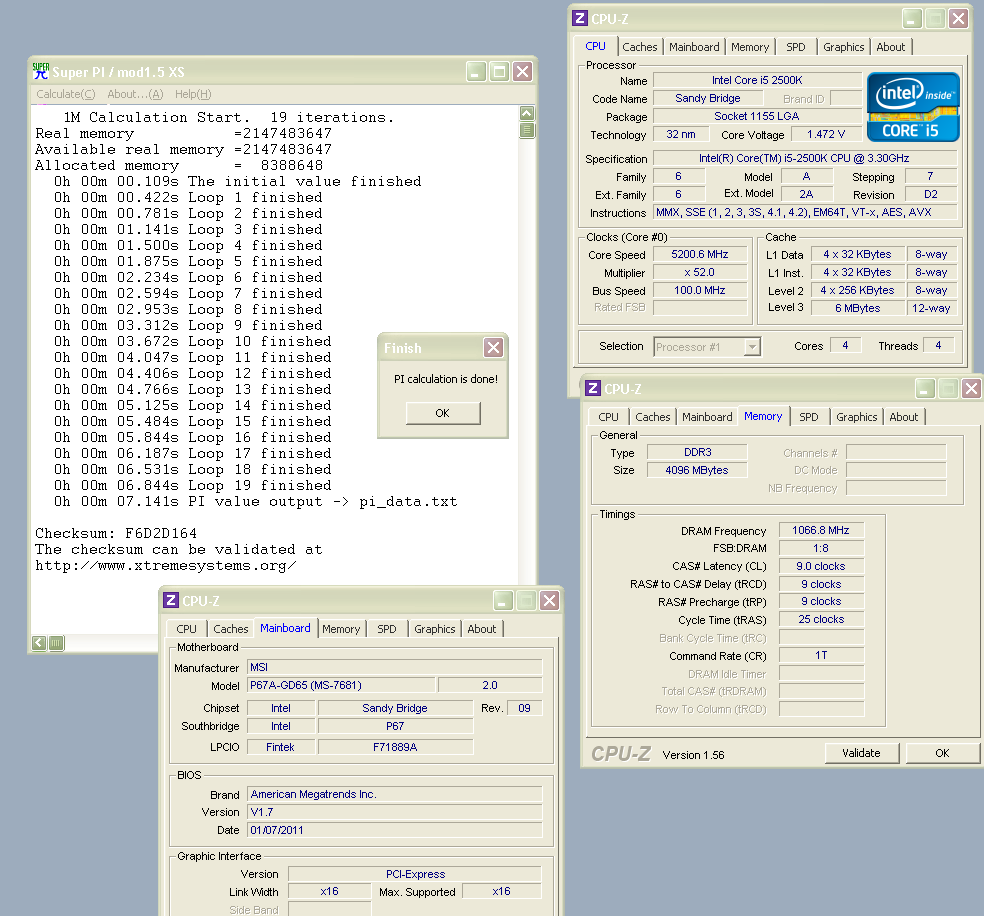 wPrime 32m - 4sec 577ms - OC Maximus (OCAlliance) - (Intel Core i7 2600K @5271MHz) 14 + 1.1 points wPrime 1024m - 2min 25sec 15ms - OC Maximus (OCAlliance) - (Intel Core i7 2600K @5271MHz) 13.5 + 1.3 points SuperPi - 7sec 31ms - OC Maximus (OCAlliance) - (Intel Core i7 2600K @5271MHz) 4.5 + 0.1 points SuperPi 32m - 6min 59sec 63ms - OC Maximus (OCAlliance) - (Intel Core i7 2600K @5225MHz) 5 + 0.1 points PiFast - 13.97 sec - OC Maximus (OCAlliance) - (Intel Core i7 2600K @5271MHz) 13.3 + 0.1 points Plenty of work still ahead of me, especially in SuperPi. OCM :thumbsup: |