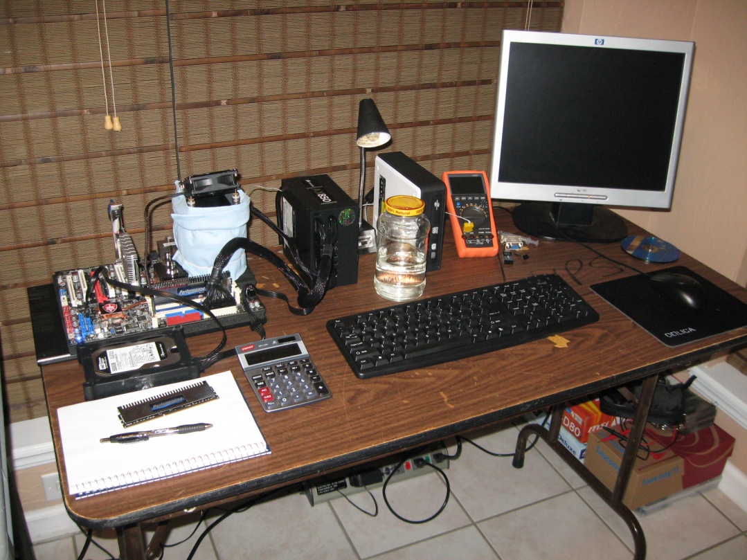 Up next we have the Q6600 paired up with the Blackops with a bottle of my special moonshine in the middle. Everything is prepped and ready for when the baby goes to bed tomorrow night. All 2D benches will be hit except PCMrk05 and that is only because my biggest GPU is a 5450! ROFL Looking to at least pick up on 100 hardware boints. Hoping I can set aside every Friday night for a session. :keeporder: