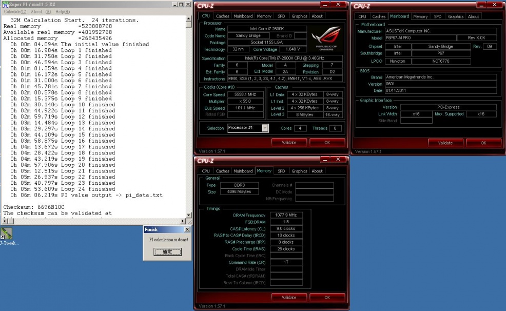 SuperPi - 6sec 953ms - OC Maximus (OCAlliance) - (Intel Core i7 2600K @5326MHz) 4.4 + 0.1 points wPrime 1024m - 2min 23sec 703ms - OC Maximus (OCAlliance) - (Intel Core i7 2600K @5326MHz) 15.3 + 3.7 points wPrime 32m - 4sec 547ms - OC Maximus (OCAlliance) - (Intel Core i7 2600K @5326MHz) 13.5 + 3 points PiFast - 13.83 sec - OC Maximus (OCAlliance) - (Intel Core i7 2600K @5326MHz) 11.8 + 0.1 points Gskills should be here Monday. Then I'll give her another go. |