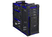 The LanBoy Air sports unprecedented top-to-bottom mesh construction for extensive air ventilation and includes five 120 mm fans (two front-adjustable speed 120 mm blue LED fans and three 120 mm TwoCool two-speed blue LED fans) with space to mount up to 15 total fans. The fans are positioned to create positive air pressure, bringing cool air in and around hard drives and graphics cards, and expelling hot air and dust through the chassis' perforated panels.